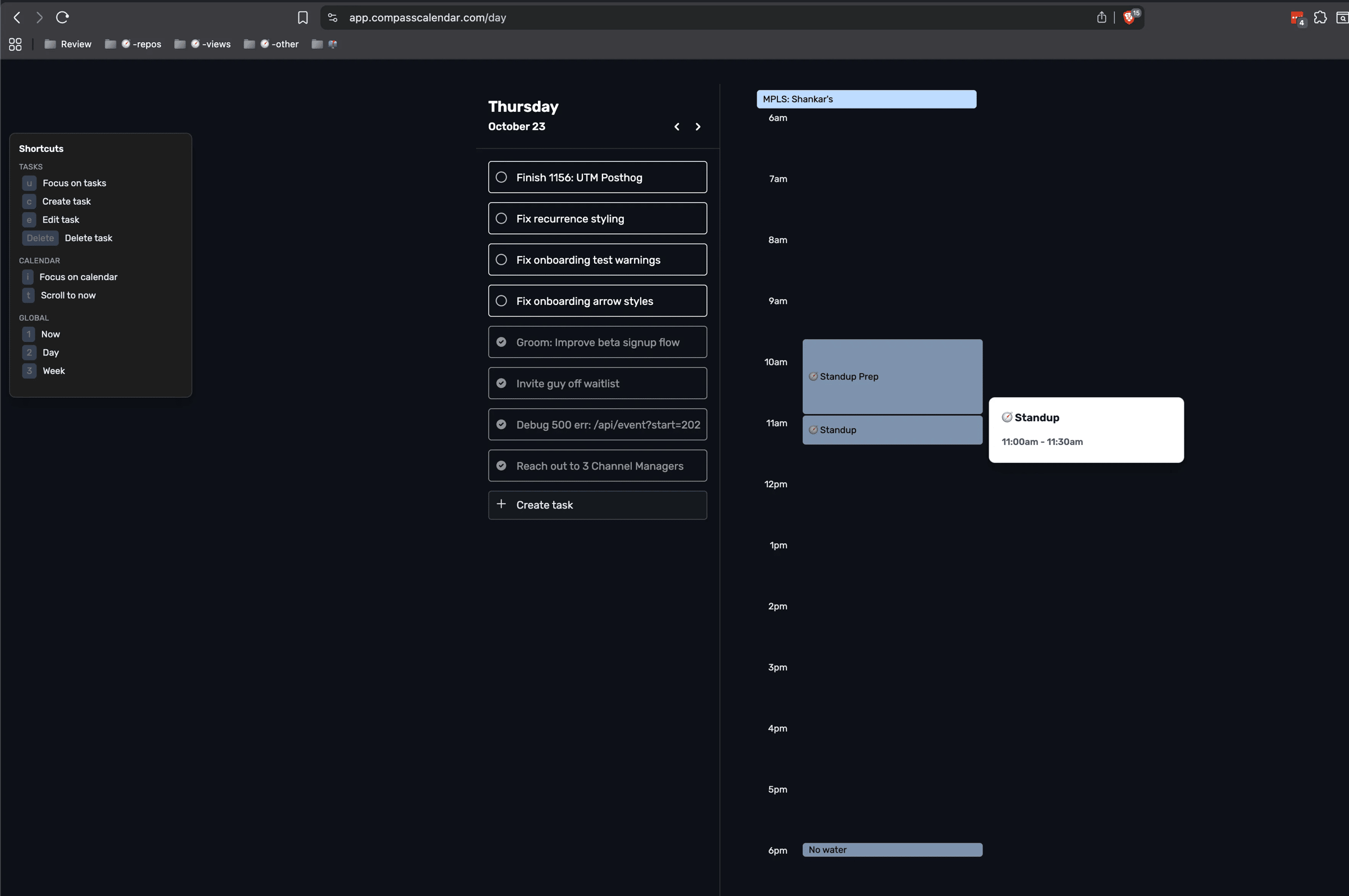 You can already plan your month and week in a lightweight way in Compass Calendar. Now you can also plan your …. day! *John Cena entrance music* #tek It’s a task list next to your agenda. Pretty straightforward, but don’t underestimate the power of simplicity. Showing one day’s worth of tasks/events will help you turn off that monkey brain and lock in on what you need to do today. We also added shortcuts to help manage the tasks, which will keep your mind focused and your hands away from the...