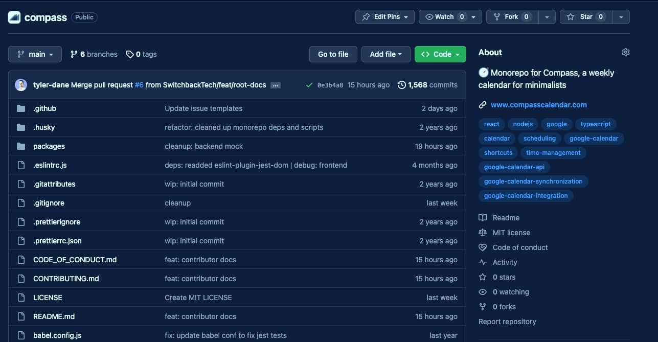26 months of work, including 461 files, 21,905 lines of code, and 171 tests, is now public at https://github.com/SwitchbackTech/compass! Anyone can read the code, suggest features, fix bugs, or even copy it for profit. I never finished building my dream calendar. But now that the code is public, perhaps someone will be able to build theirs. Sweet, sweet code What does this mean for you as a user? Your data will stay on Compass Calendar’s private databases and will not be accessible by anyone...