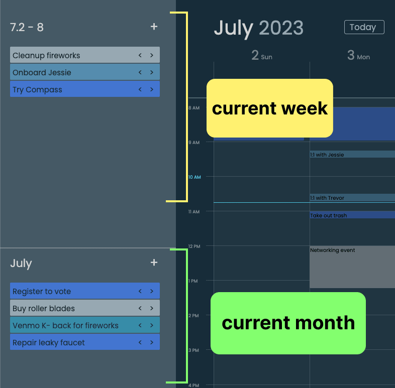 Compass now lets you keep track of monthly tasks in the sidebar! This means that you can organize your tasks based on 3 types of urgency: Urgent with clear date & times: calendar Urgent with semi-clear date/time: week list Not urgent, unclear date/time: month list Here's what that looks like: weekly + monthly lists in sidebar Organizing tasks in this way makes it easy to gradually plan your day. It demands consistent engagement with your schedule, forcing you to get real about what you can...